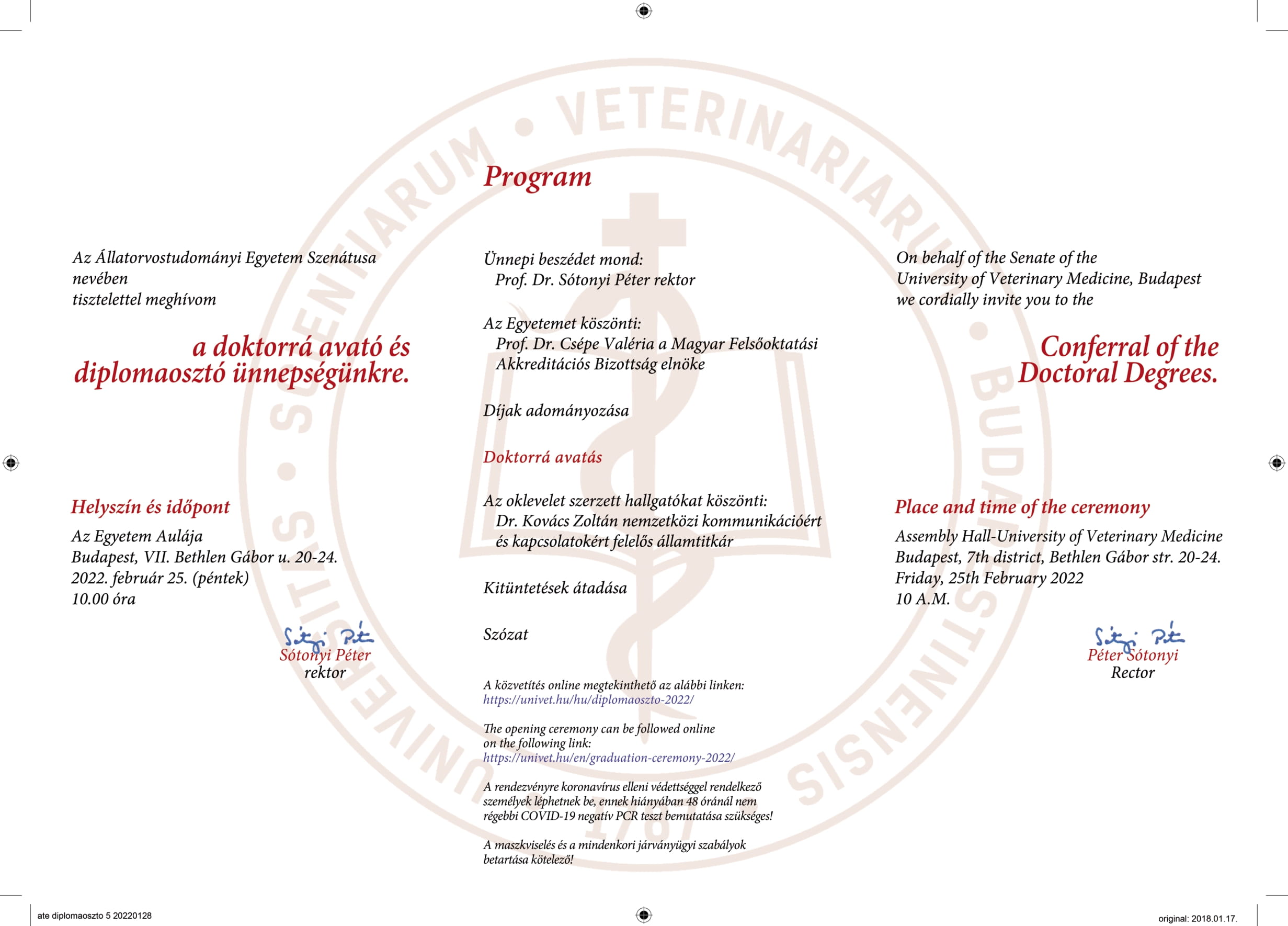 On behalf of the Senate of the University of Veterinary Medicine Budapest, we cordially invite you to the Conferral of the Doctoral Degrees and Graduation Ceremony which will be streamed online.