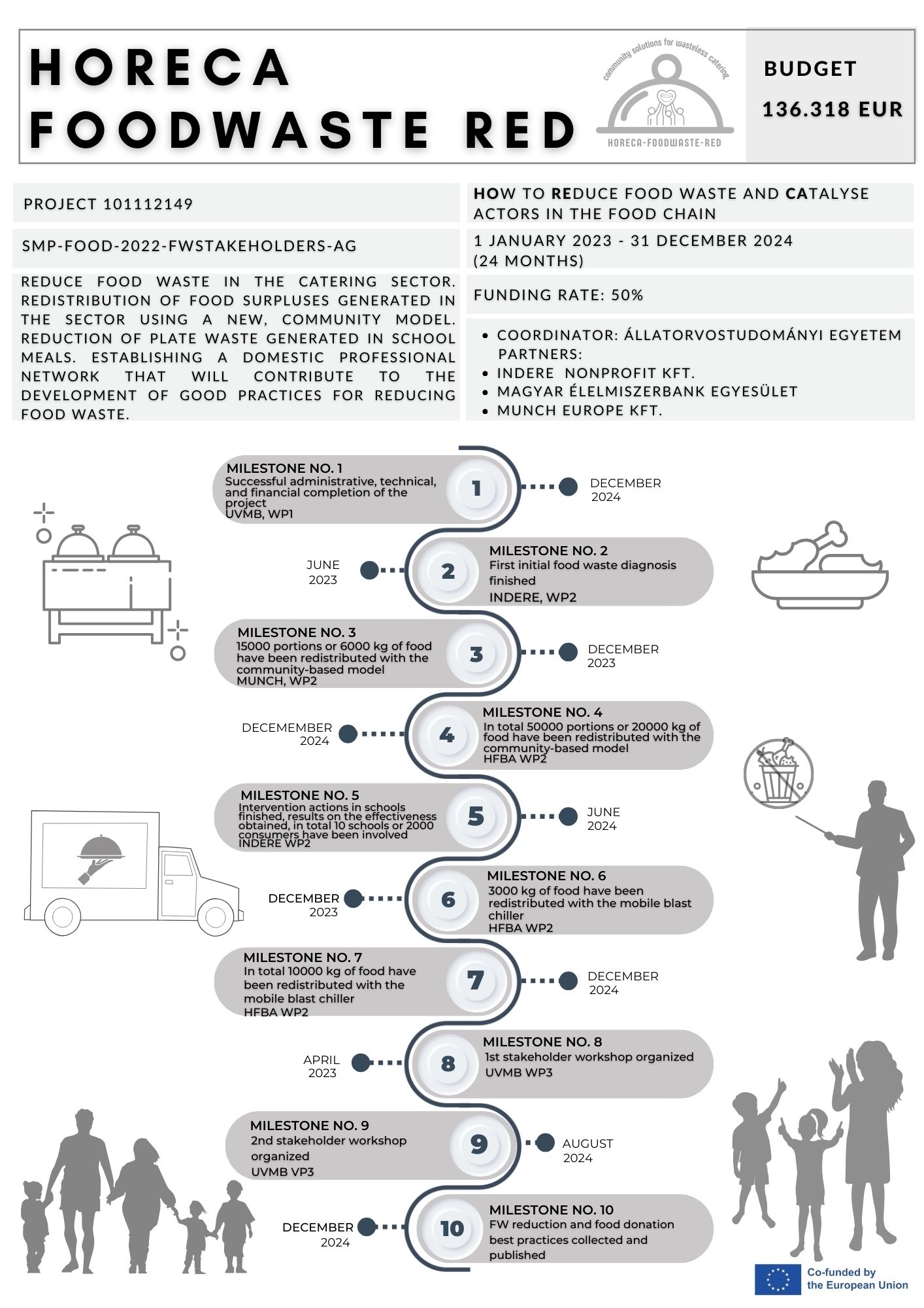 The project aims to target food waste reduction in the hospitality and food services sectors. The project actions will focus on donation possibilities in the HORECA and event catering sub-sectors, as well as consumer food waste reduction in school canteen settings. The small amount of food surplus that is often generated in the sector is most of the time perfectly suitable for human consumption, but due to the lack of a proper managerial and redistribution system, it often becomes waste. The valorization of these food items requires a high level of attention and an advanced logistics system in order to comply with food safety requirements. The first pillar of the project aims to develop the organisational structure of a new donation model that corresponds to the characteristics of the sector. The objectives involve the enhancement of food donation through a community-based approach and the development of the logistical system for blast chiller equipment. Food consumption behaviour in the school canteens is influenced by a set of complex mechanisms, such as consumer expectations, preferences, the available time, the temperature of the food, the amount of food, and social norms. The second pillar of the project will target food waste reduction in school canteens by conducting an initial food waste diagnosis and testing awareness-raising intervention actions.