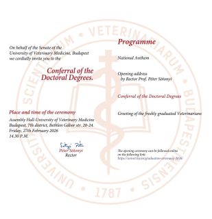 On behalf of the Senate of the University of Veterinary Medicine Budapest, we cordially invite you to the Conferral of the Doctoral Degrees and Graduation Ceremony, which will be streamed online. Date: 27 February 2026, 14:30 (Friday) The event will be broadcast live here: https://univet.hu/en/graduation-ceremony-2026/ Download the invitation in pdf. Download the invitation in pdf.