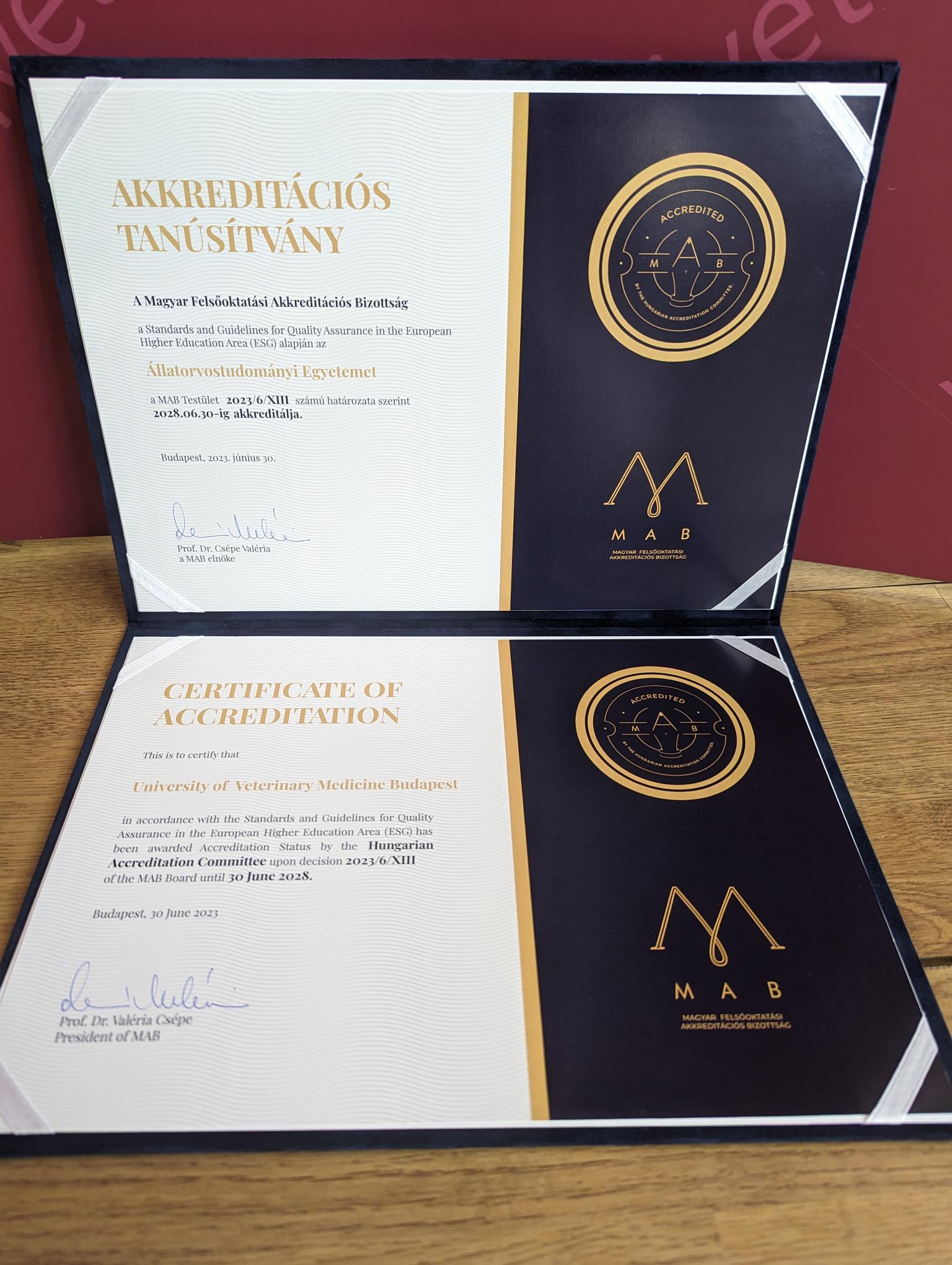 A Magyar Felsőoktatási Akkreditációs Bizottság, a felsőoktatási minőségbiztosítás európai sztenderdjei (Standards and Guidelines in the European Higher Education Area, ESG 2015) alapján értékelte az Állatorvostudományi Egyetem minőségbiztosítását, melynek értelmében intézményünket 2028. június 30-ig akkreditálta.