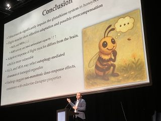 Dr. Mackei Máté, egyetemi adjunktus adta a konferencia peszticidekkel foglalkozó szekciójának nyitóelőadását, melynek témája a tebukonazol, mint mezőgazdasági fungicid szer redox rendszerre kifejtett hatásainak vizsgálata volt mézelő méhek repülőizmaiban.