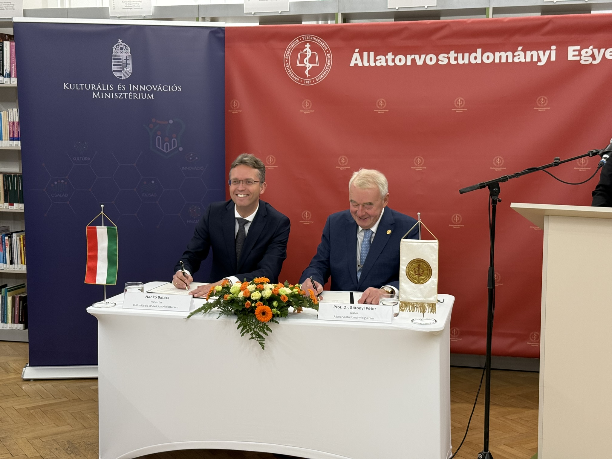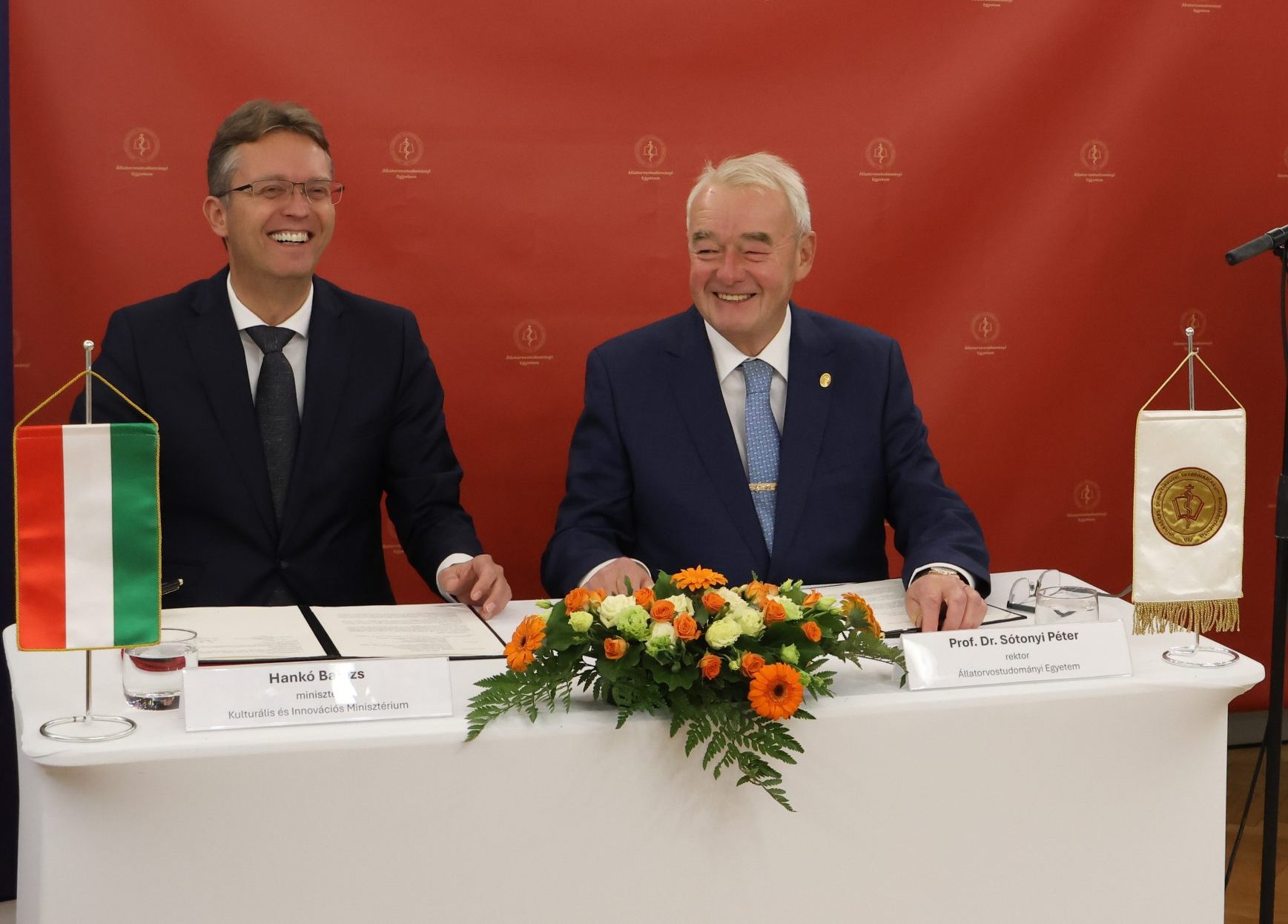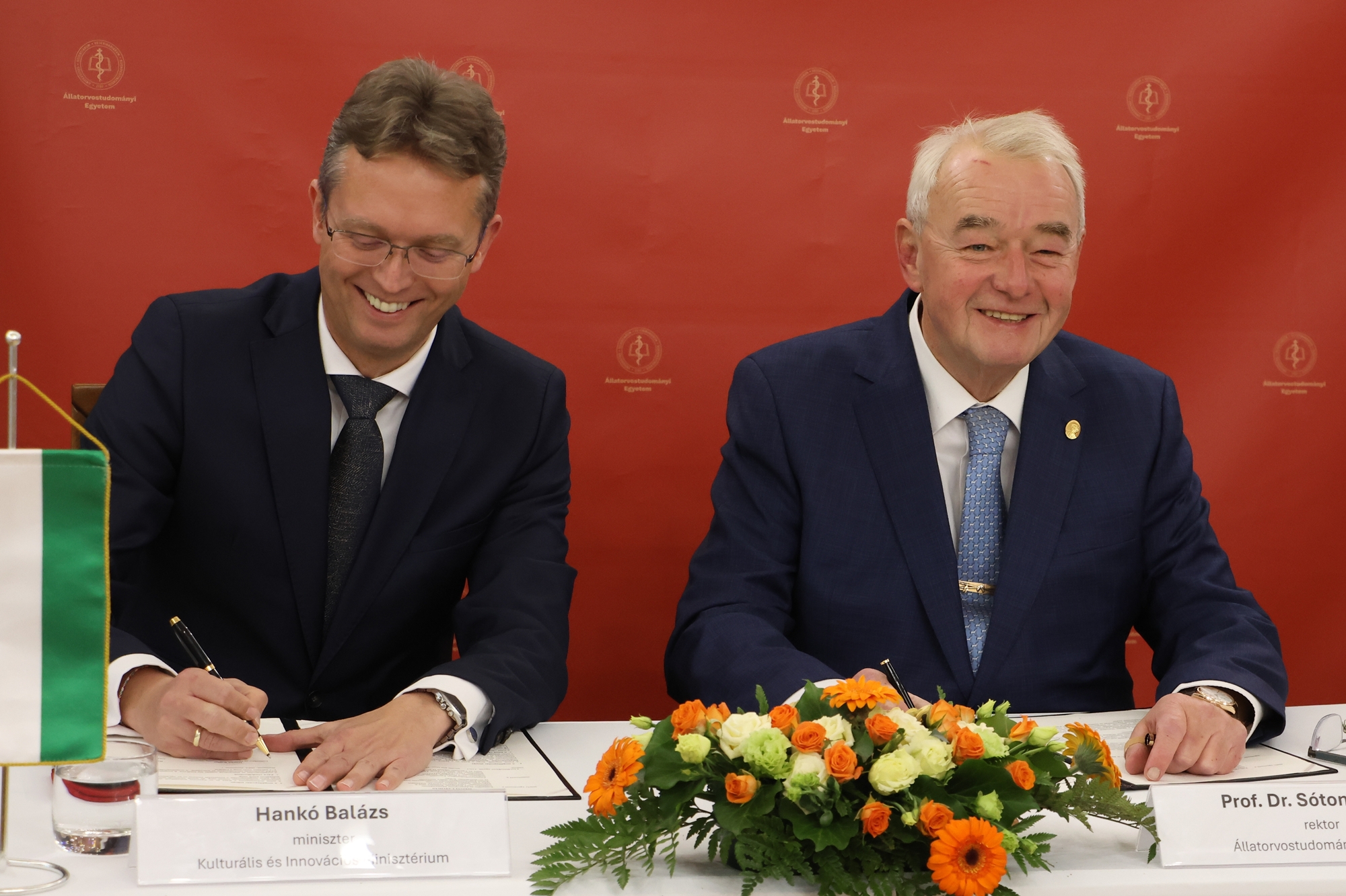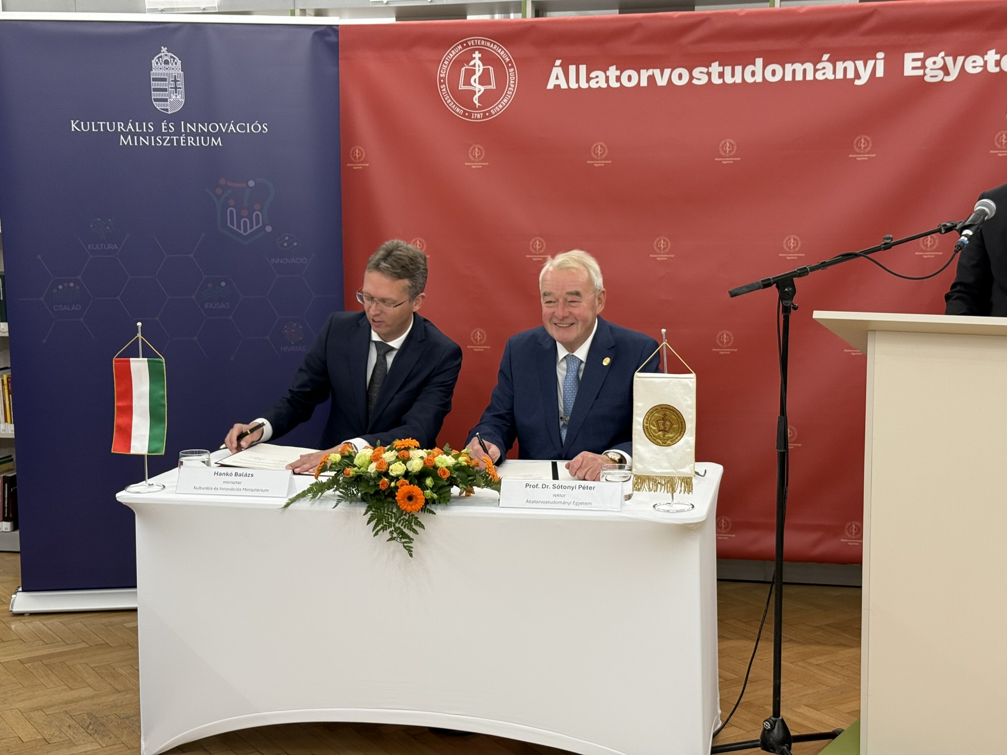 Prof. Dr. Sótonyi Péter rektor és Dr. Hankó Balázs kultúráért és innovációért felelős miniszter 2025. december 1-én ünnepélyes keretek között írta alá az Állatorvostudományi Egyetem és a Kulturális és Innovációs Minisztérium közt létrejött együttműködési megállapodást, amelynek keretében a kormányzat huszonnyolc milliárd forint támogatást biztosít a campus további fejlesztésére.