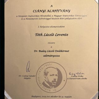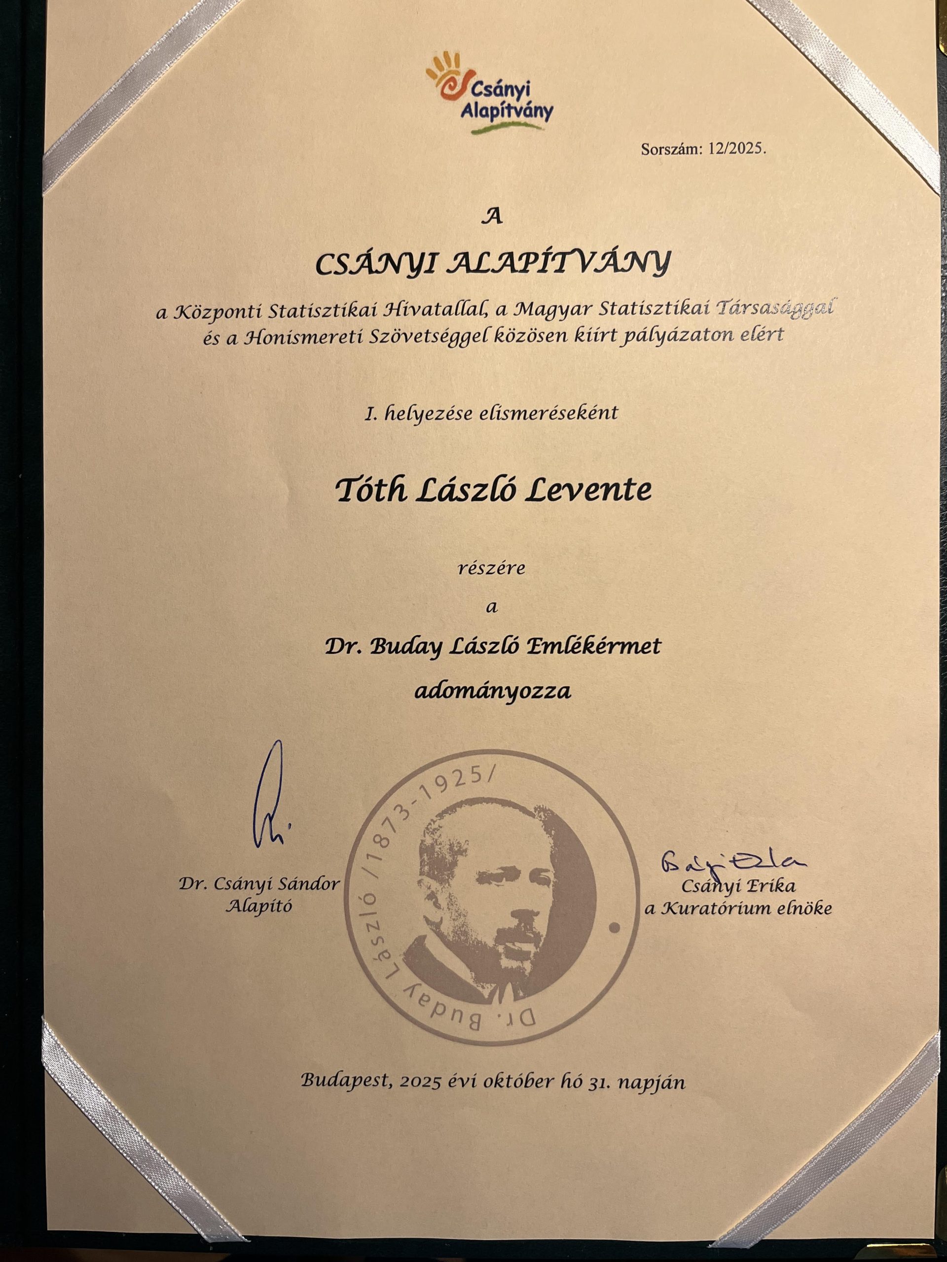Könyvtárunk munkatársa, Tóth László Levente a szakmai zsűri egyhangú döntése szerint első helyezést ért el a Csányi Alapítvány, a Központi Statisztikai Hivatal (KSH), a Magyar Statisztikai Társaság (MST) és a Honismereti Szövetség (HSZ) által a KSH korábbi elnökére, Buday Lászlóra emlékezve, halálának 100. évfordulója alkalmából kiírt irodalmi pályázaton.