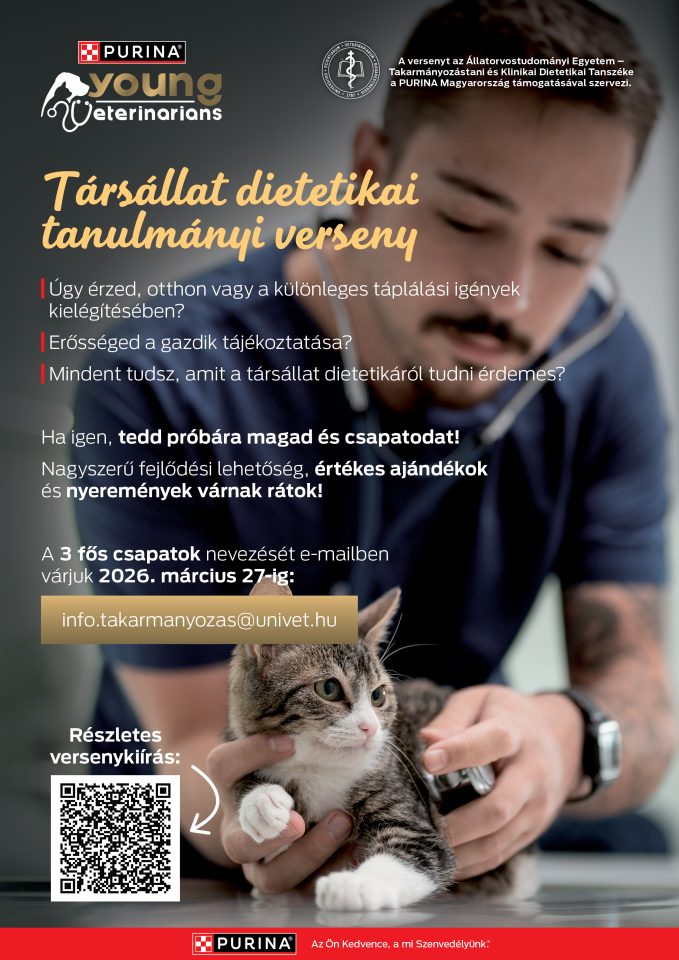 Szeretettel várjuk a negyed- és ötödéves hallgatók jelentkezését a 2026. április 10-én 10:00 órakor megrendezésre kerülő társállat-dietetikai tanulmányi versenyre. A verseny célja, hogy a résztvevők játékos, ugyanakkor szakmailag igényes formában mérhessék össze tudásukat a társállatok takarmányozása és dietetikája területén.