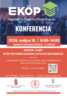 Egyetemi Kutatói Ösztöndíj Program (EKÖP) Konferencia Kezdés: 2026-05-12 09:00Vége: 2026-05-12 14:00 A 2026/2027 tanévre vonatkozó pályázati kiírás már elérhető itt!